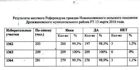 Результаты местного Референдума граждан Новоишлинского сельского поселения Дрожжановского муниципального района РТ 13 марта 2016 года.