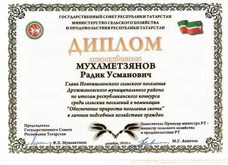 20 декабря 2016 года в г. Буинске состоялся зональной семинар по повышению деловой активности населения. На семинаре наградили лучших Глав сельских поселений, семейных ферм и лучшее личное подсобное хозяйство. В номинации «Обеспечение прироста поголовья скота» в личных подсобных хозяйствах граждан награжден Глава нашего сельского поселения Мухаметзянов Радик Усманович, с чем и его поздравляем.